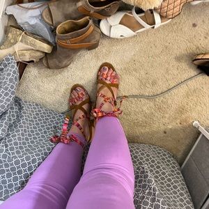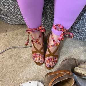 THE CUTEST GUESS CHUNKY HEELS TIE UP LACE BALLERINA SUMMER RIBBON TAN CORK 9 EUC