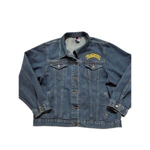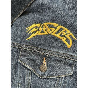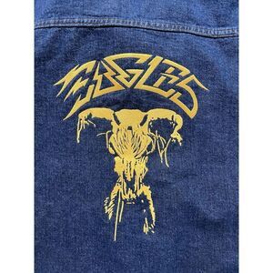 This Jacket is a vintage blue denim jacket featuring an embroidered band logo of The Eagles, making it a unique and limited edition piece. With a classic fit and mid-length style, this unisex jacket is perfect for fans of rock and roll, offering a touch of nostalgia with its 80s-inspired design. The jacket includes a button closure, long sleeves, and pockets for added functionality, making it a versatile addition to any wardrobe for all seasons. Made in the United States, this plus-size 2XL jacket is a must-have for collectors and enthusiasts of The Eagles and classic rock music.