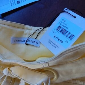 Lemon yellow, side zipper with a wide belt. Wide leg pant. Cotton spandex blend.