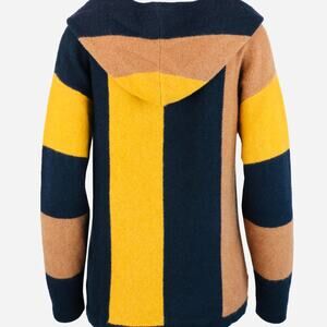 TES plush, cozy baja hoodie in camel, goldenrod, and navy wide stripes.