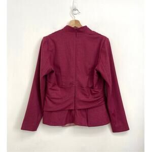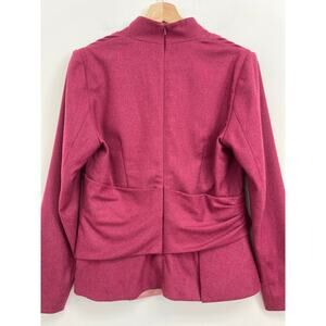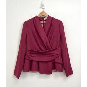 "This directional hybrid functions both as a jacket and as a top. It is impeccably tailored with a crossover V-neckline, pleat details and a signature wrapped waist for a figure-enhancing, defined silhouette. Work the warm magenta shade with dark tailoring and a berry lip."