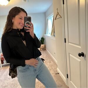 I adore this super pretty designer THE GREAT. black silk embroidered tie neck blouse/top/jacket