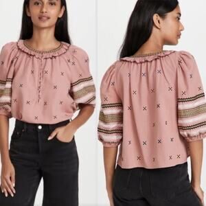 THE GREAT Clementine Embroidered Linen Cottagecore Blouse Pink Rosette X-Small