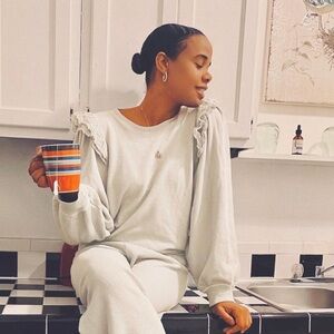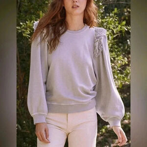 Fabric: Mid-weight french terry. Ruffle trim with eyelet details. Ribbed edges. Crew neck and puff sleeves.