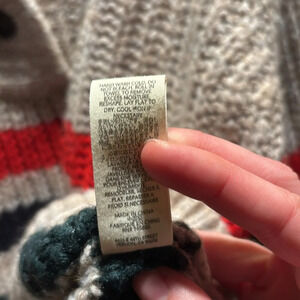 Cozy V-neck sweater. Features bold red and navy and green stripes. Soft knit texture.