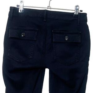 Features: Cropped skinny fit, button front closure, side slit pockets, back flap pockets with button closures, utilitarian-inspired style