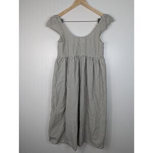 Chic midi dress with a classic striped pattern. Features a button-down front and cap sleeves. Perfect for casual outings.