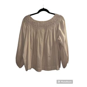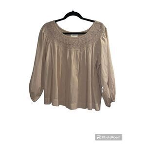 This soft cotton top has a beautiful embroidery smocked neckline and swingy easy shape. Intended to hit at the hip.