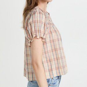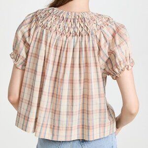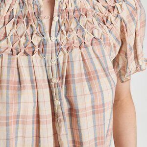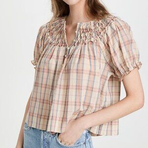 Intricate smocking at the yoke adds to the charming look of this linen-blend THE GREAT. blouse. Wear it with high-rise jeans and add flat sandals to complete your look. Barely/Lightly Worn | EUC Size Medium | 2 80% Cotton | 20% Linen Fabric: Lightweight, non-stretch weave Smocked yoke Pleating details Round neck and short puff sleeves with covered elastic sleeves Plaid pattern Partial button placket Shell: 80% cotton/20% linen Wash cold