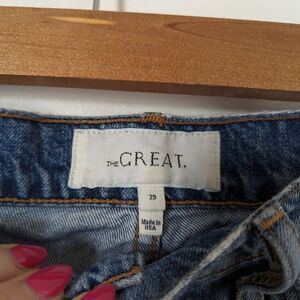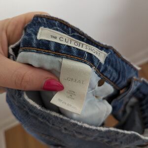 THE GREAT. The Cut Off Short in a medium wash indigo denim. 100% cotton structured jean shorts, distressed frayed ripped look, mini short design with a high waisted rise. Classic everyday wardrobe staple. Gently worn, excellent condition, no holes/stains.