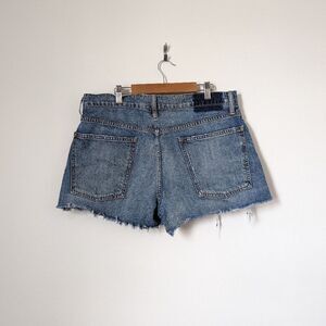 THE GREAT. medium wash blue denim cut off frayed distressed mini jean shorts
