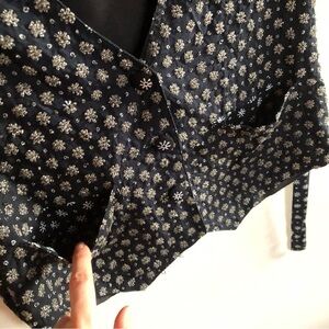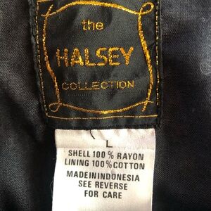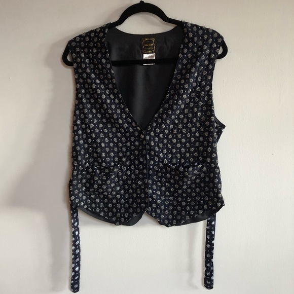 Halsey vintage vest with beaded front. It’s in good condition but there are a couple of spots where beads a missing. It’s not noticeable unless you’re looking up close because there is also a printed pattern that mirrors the beads. Tie back.