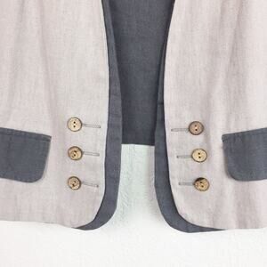 Features: woven, thick material; no stretch; no closures; wooden buttons, but not functional, brand new without tags