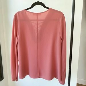 This blouse is in nearly new condition. Dusty pink in color with a cris cross detail at the neck line. Small v neck with elastic around the wrist. Such a great color and has a textured look to it. Semi sheer. Size tag has been removed but it’s a small