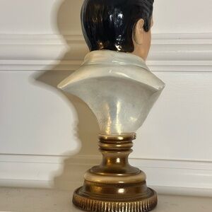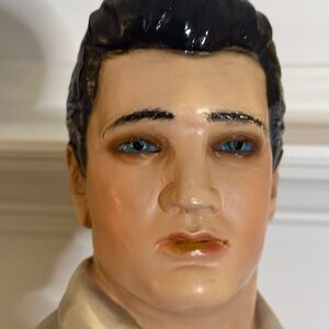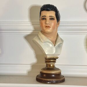 Bring a touch of iconic charm to your space with this striking bust sculpture, capturing the essence of a classic 1950s figure. The hand-painted details highlight expressive blue eyes and slicked-back black hair, resting on a golden-toned pedestal that adds a hint of vintage elegance.