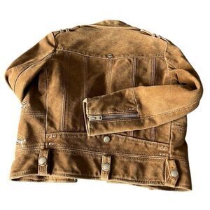 A brown suede motorcycle jacket showcases a classic biker style with a wide lapel collar, multiple silver zippers, epaulets, and adjustable buckle straps at the waist. The jacket's shiny metal snaps and buttons enhance its edgy aesthetic, blending functionality with stylish design.