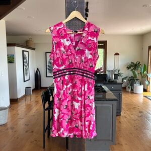 This elegant pink sundress by The Kooples is a short, sleeveless 100% silk dress with a pink floral print.