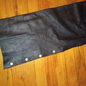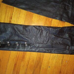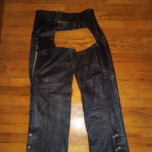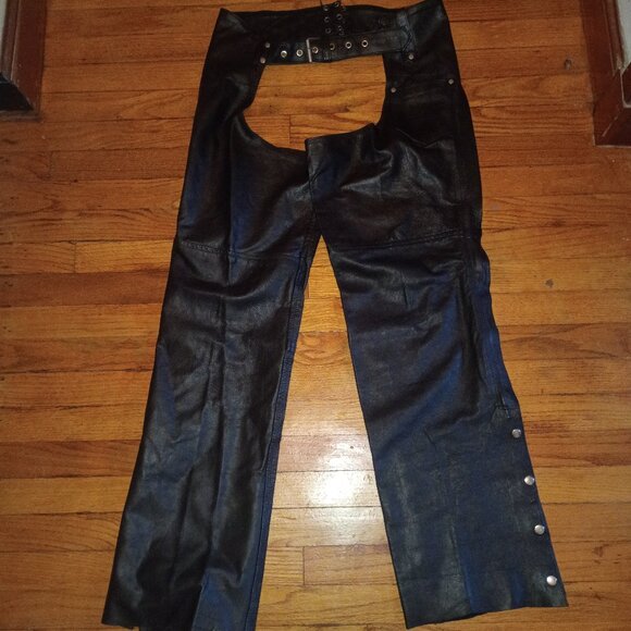 Just in time for cool weather riding, great pair of men's size XL black leather chaps from LEATHER CLUB. These adjustable waist (32" to 38") chaps have it all; zippers on the legs, snaps on the cuffs, adjustable buckle belt and laces up the back. Oh--and pockets. With 32" inseam. In great condition, don't show any wear that I could see. Please see photos. Leather in good condition, no wear to cuffs.