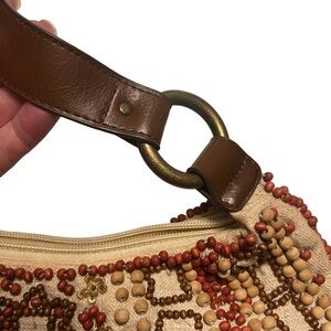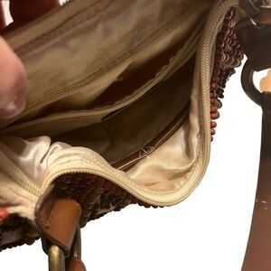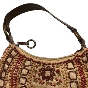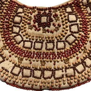 "The Limited" brand Sequined/beaded Satin Women's shoulder handbag. Great for any occasion! The bag is beige satin with sequins and beads in tan and copper and red tones. Brass hardware and zipper closure. Inside has two slip pockets and one zipper pocket and is free of any marks.