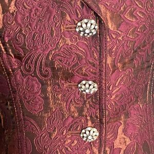 Bought it for a holiday party and never wore it. Beautiful cropped blazer is fully lined, has notched collar, no padding in shoulders, 3 rhinestone accented buttons. Jacket is shaped and figure flattering. Lovely cranberry/fiery bronze. (Winter White trousers bought to match are available in another listing) Size 2