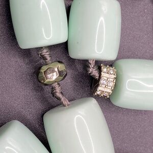 THE LIMITED Mint Green Glass Beads Hand-Knotted Silk Long Necklace. Measures approx 42" and has lobster claw clasp. Beautiful mint glass beads are hand knotted with silk and with silver and rhinestone spacerl beads. Stunning necklace may be worn single strand or doubled as shown in photos. Excellent condition and appears barely worn, if at all. #18