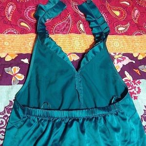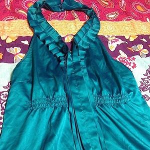 THE LIMITED S TURQUOISE TEAL BLUE SILK TUXEDO RUFFLE HALTER TOP BLOUSE
