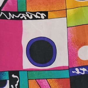 Pre-owned The Limited vintage button front silk retro top size XS. Collared short sleeve button front top with hi-low hem. Lightweight silk top with colorful geometric abstract retro design. Some areas in the white look like pink bled. Please see photos.