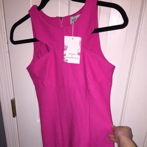 Chic bright pink shift dress with a textured finish. Feature with panel seam lines down the front, and a unique triangular cut out above the bust and a curved hemline. Perfect to show off your curves!!!!๐๐