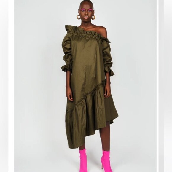 Deliciously romantic, like all daydreaming moments. An asymmetric, off-shoulder dress with soft elastic band on the sleeves and neckline and ruffle details on the skirt.