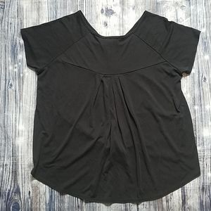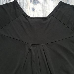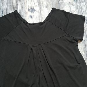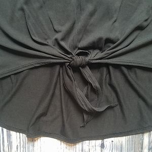 Black tie front top with a pleated style back. Made from a soft material. There is no size tag on it anymore so the measurements are armpit-armpit 20 inches & Top-bottom longest 22 inches & shortest 20 inches. By measurements and looking at it I'm guessing it's going to be about a Size L. In good used condition !