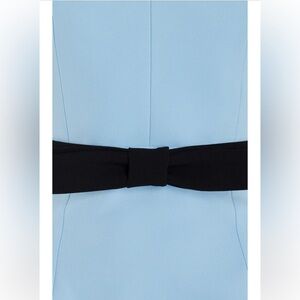 Tailored from baby blue crepe, this fitted column dress features a strapless sweetheart bodice decorated with a contrasting ribbon belt that adds a glamorous touch.