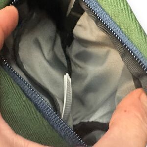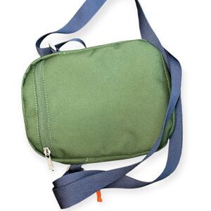 Compact, functional, and adventure-ready — this small crossbody bag keeps your essentials secure and within reach. Featuring durable green nylon fabric, contrasting orange bungee cords and zipper pulls, and an adjustable navy strap.