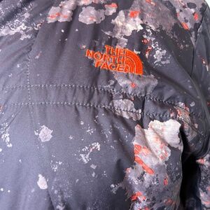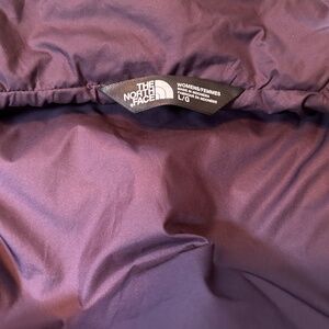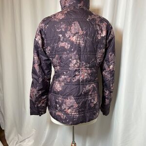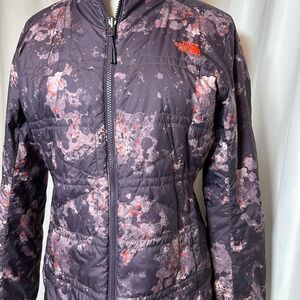 Purple floral print insulated snow zip up THE NORTH FACE Clementine Triclimate jacket. Size Large. Polyester shell. Arm pit to arm pit measures approximately 21". Shoulder to front hem of jacket measures approximately 25". Comes from a smoke-free home.
