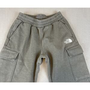 The product is a pair of The North Face Coordinates Men's Size Small Heavyweights Fleece Cargo Joggers Sweatpants in a solid gray color. These pants feature a drawstring closure, flat front, and mid-rise fit. Made of a blend of polyester and cotton fleece fabric, they are machine washable and designed for casual occasions during the winter and spring seasons. The jogger style offers a comfortable and regular fit, with slash pockets and a logo accent. Perfect for outdoor activities or everyday wear, these North Face sweatpants combine style and functionality for the modern man.