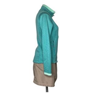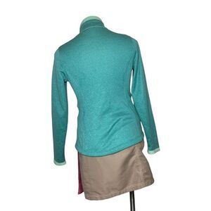 Calming heathered green soft shell exterior with stylish seaming, darker zipper accents, light green ultra soft interior. Full zipper front closure. Two zippered pockets. Slightly tapered at the waist and then wider at the bottom for a more feminine silhouette. High neck zippers to the top or left slightly open. There was a sticker on it, which left a very slight residue of two lines at the top right, as shown in photos circled in white. You can barely see it because it can barely be seen. You’re only going to notice it if you look for it. Slightly darkened cuffs. No tears or rips.