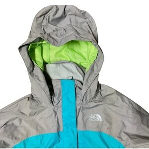 Teal and gray jacket by The North Face. Features a hood and zip closure.