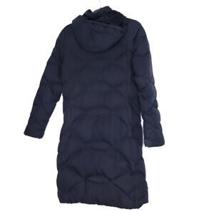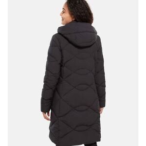 Diamond quilted front and oval quilted back water-resistant jacket. Features a removable hood, two-way front zip closure with snap placket, and two on-seam zip pockets. Long sleeves and an inner secure zip media pocket. Partial fleece lining at upper back, and insulated with 550 fill power down.