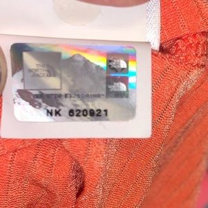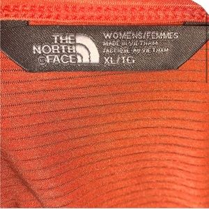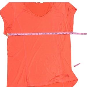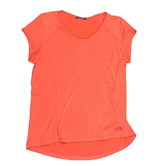 The North Face orange performance tee. Striped fitted shirt, embroidered logo on front of shirt. V neckline. No stains, holes, piling. Excellent used condition. Smoke free home. lol