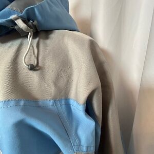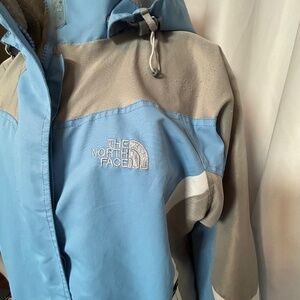 THE NORTH FACE Summit Series Hyvent waterproof hooded coat. Size Medium. Measures approximately 23" arm pit to arm pit. There are some "picks" in the gray portion of the coat. See pictures. Comes from a smoke-free home.