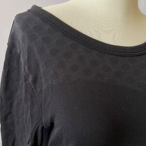 No size tag, fits a womens size Medium, black, scoop neck, long sleeves, pull on, hip length.