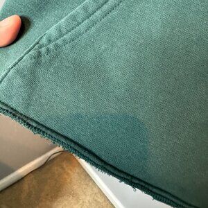 Sweatshirt has been altered at the hemline. It's more a raw finished hemline. Not sure if it was done professionally, but it doesn't look as though it will come unraveled as it is a finished hemline. See photos.