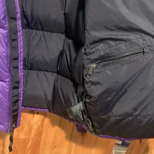 The North Face brand purple puffer jacket in like new condition. This is super warm and trendy for that perfect oversized look. Two pockets on the outside, one small one inside. Adjustable drawstrings inside.