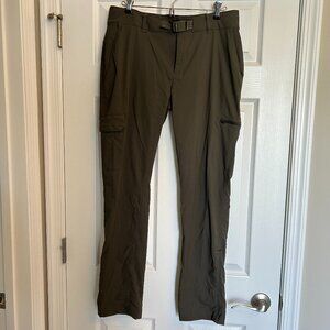 THE NORTH FACE women's olive green hiking pants. Snap front and zipper closure, plus a built-in belt for added adjustability. Pockets galore: 2 hand pockets lined in mesh; 1 zipped security pocket in back; and 2 cargo pockets, one with Velcro closure & the other has a zipper. Legs can be rolled up with roll-tabs to capri length--extra roll-tab button is sewn onto fabric tag. "The North Face" name/logo appears on front snap, belt buckle, and on back right hip. These pants feel like they've never or seldom been worn. NOTE: one tiny "pull" on lower part of back right leg (see final photo)--otherwise these rugged and versatile pants are in excellent pre-loved condition.