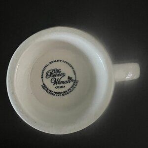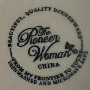 Chic cream-colored ceramic cup / mug from Pioneer Woman features an intricate red starburst or flower blossom pattern that wrap around the exterior. Sits on an elegant turquoise base with matching turquoise band at the rim. Sports a stylish handle with a comfortable raised thumb rest. Dishwasher and microwave safe, Measures 4.5” tall with a 3.75” diameter; 2.75” at base and 5” across at the top including the handle. Holds 14 fluid oz. From The Pioneer Woman. Underside reads, The Pioneer Woman. BEAUTIFUL,QUALITY DINNERWARE ~ FROM MY FRONTIER TO YOURS.