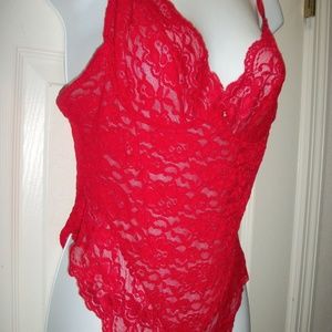 IT IS RED LACE ALL OVER, WITH UNDERWIRE AND HAS SATIN THE STRAPS THAT ARE ADJUSTABLE AS SHOWS IN THE PHOTOS. IT HAS VERY HIGH CUT LEGS. IT HAS 3 SNAP CLOSURES AT THE CROTCH WHICH IS GREAT FOR EASY OPENING AND CLOSING BACK. IT IS PREOWNED. THIS BODYSUIT COMES IN A SIZE MEDIUM.
