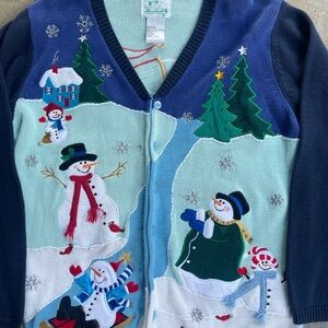 THE QUACKER FACTORY Christmas Cardigan Size Large Snowman Family