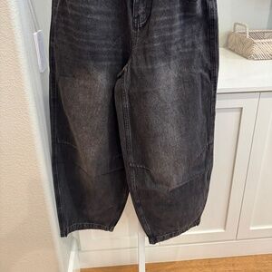 BLEACHED DENIM, BAGGY FIT CROPPED JEAN W/TAPERED HEM AND KNEE DART, BLEACHED CHARCOAL. 28" ENSEAM.