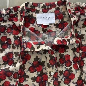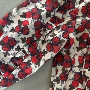 Chic blouse with red and black floral design. Long sleeves with ruffle detail and lightweight fabric.