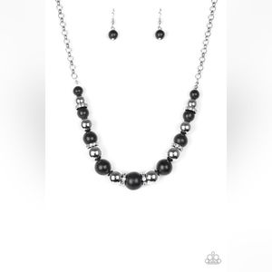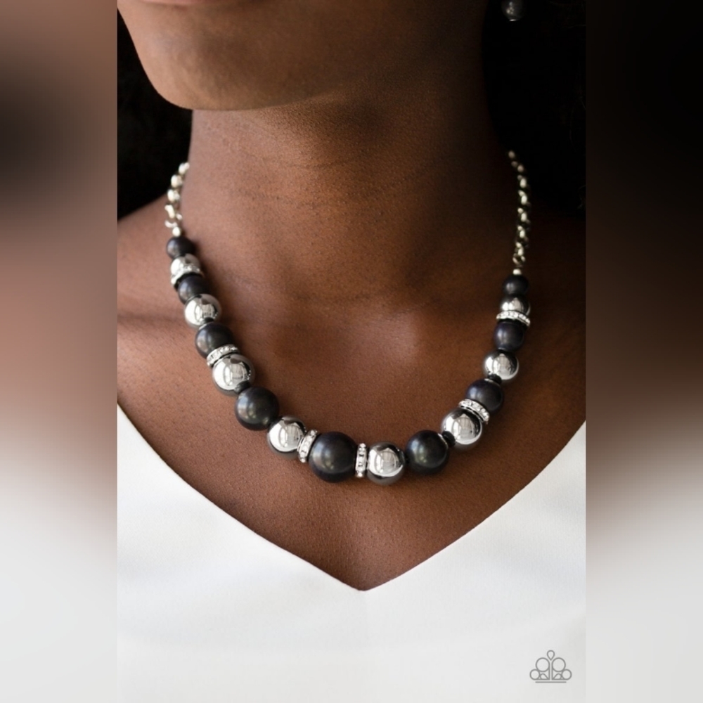 A collection of faux black stones, shiny silver beads, and white rhinestone encrusted rings join below the collar in a refined fashion. Features an adjustable clasp closure.