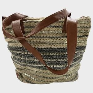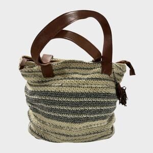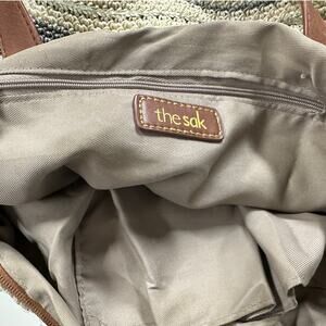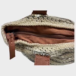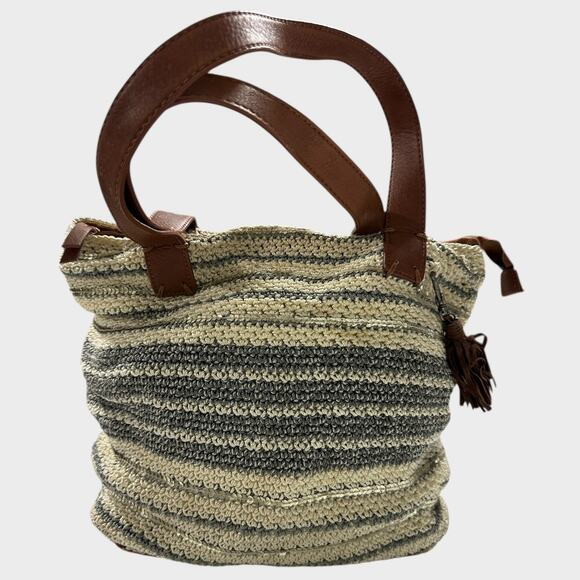THE SAK BAG Large Zipper Crocheted Leather Trim Cream Gray